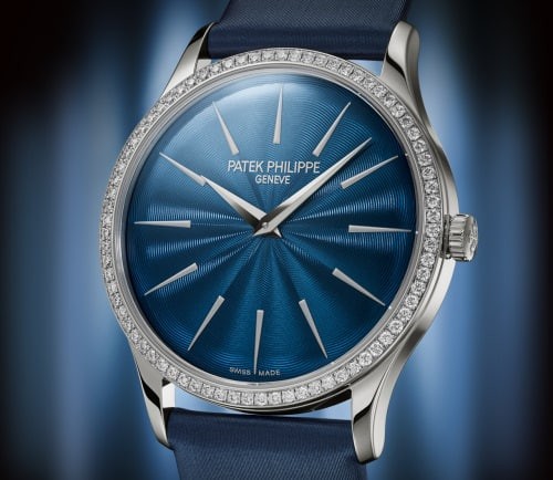This women's Calatrava timepiece features an engraved lacquered dial with a slightly enlarged case diameter (35 mm diameter) and is equipped with a self-winding movement that replaces the original manual movement. The dial is decorated with a delicate concentric ripple pattern, and the dial base panel is coated with multiple layers of transparent varnish to reveal a delicate and deep midnight blue light. The bezel is decorated with 76 round-cut flawless Wesselton diamonds. The new watch features a satin-brushed calfskin strap with a shimmering navy blue that echoes the colour of the dial.